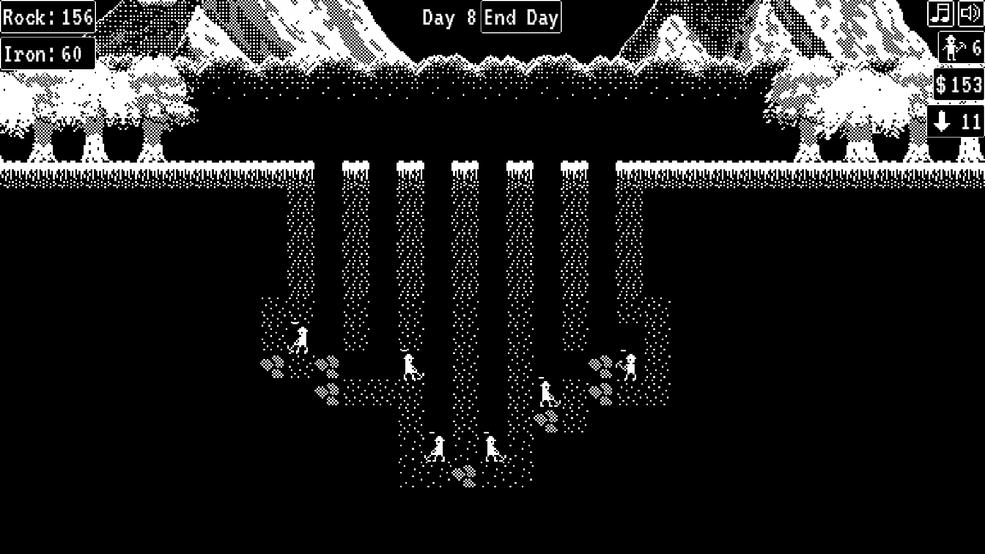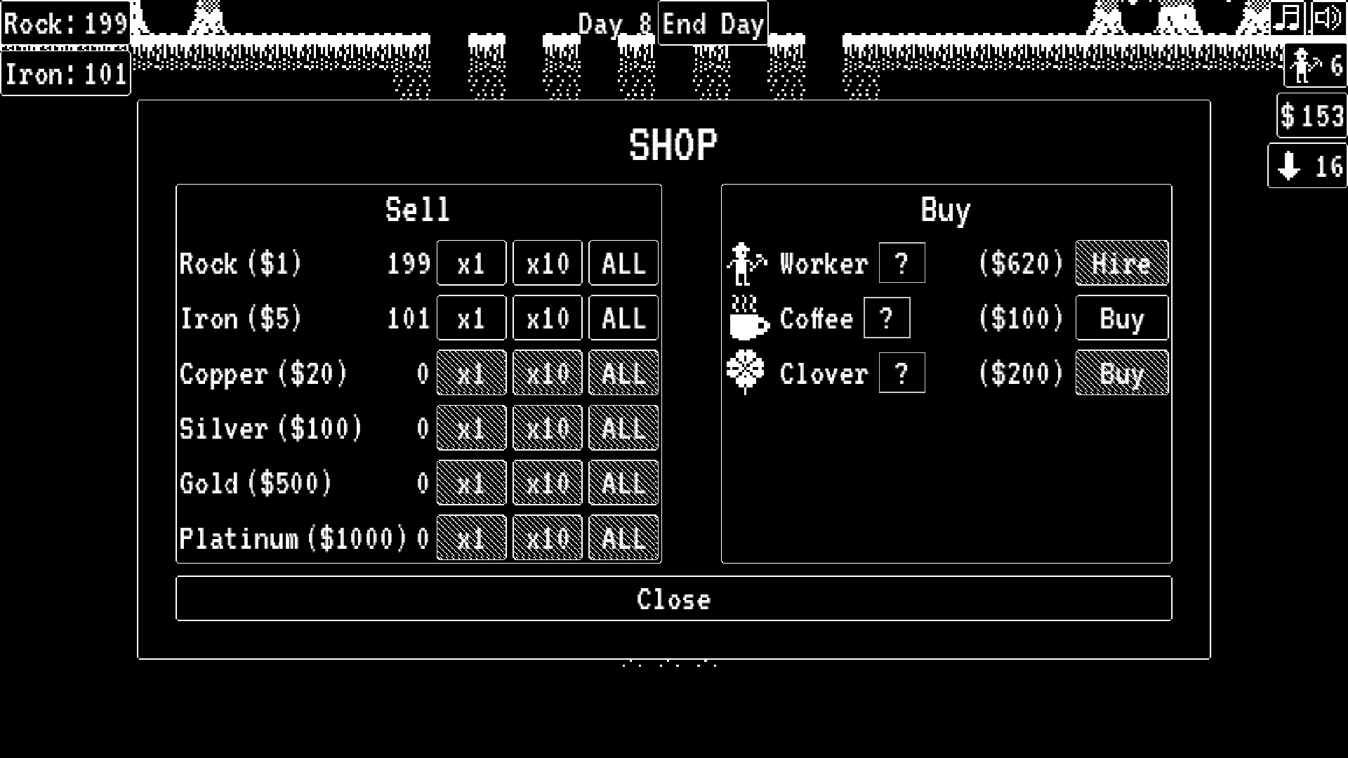 There's a 10% base chance of getting a resource instead of rock, so if you get SUPER LUCKY and get that, the miner won't even hit the third layer and you'd get 3 rock and 17 iron, which translates to $88. That's the max you can get on day 1. Which lets you hire TWO extra miners for day 2!